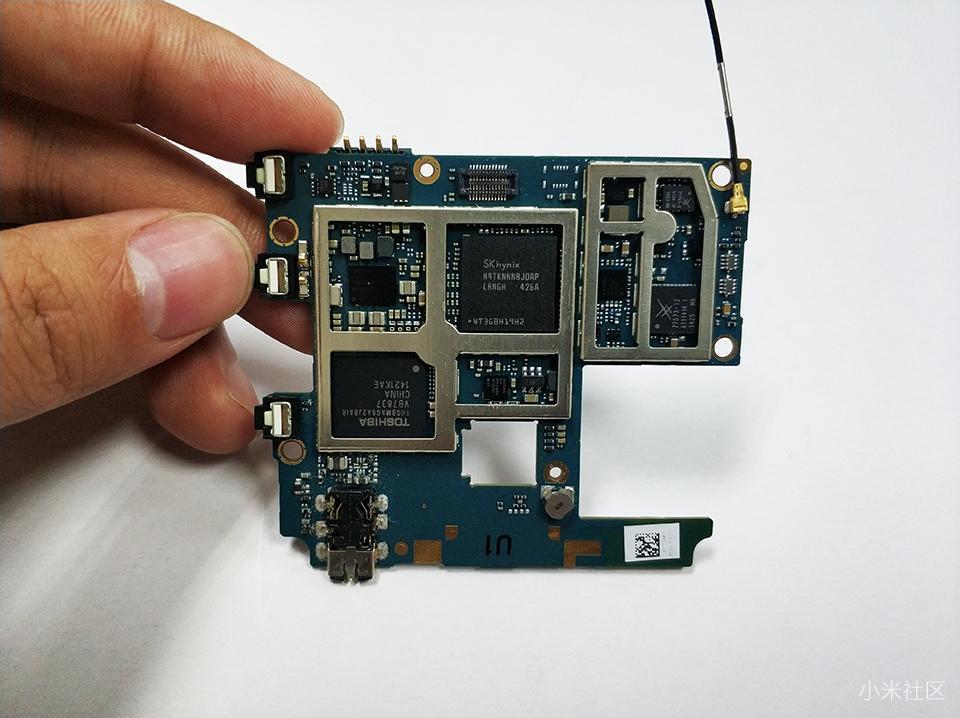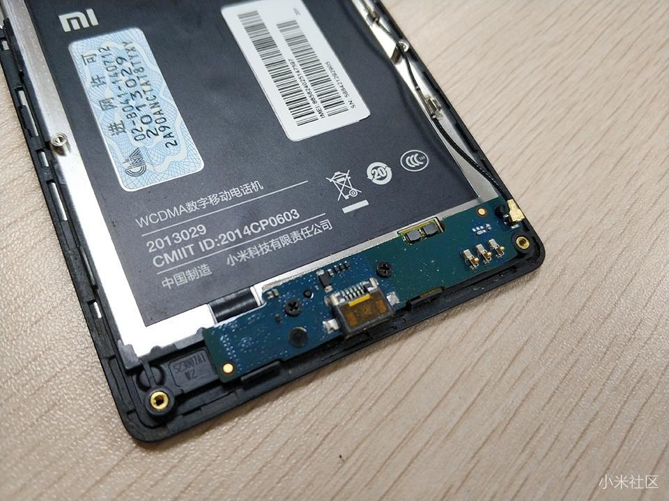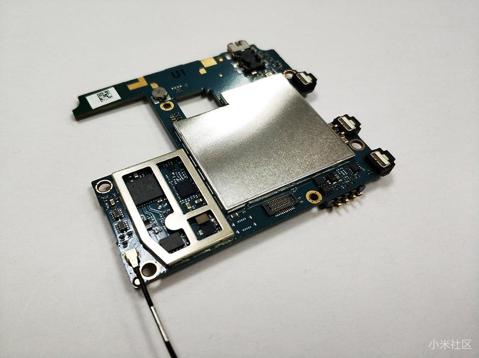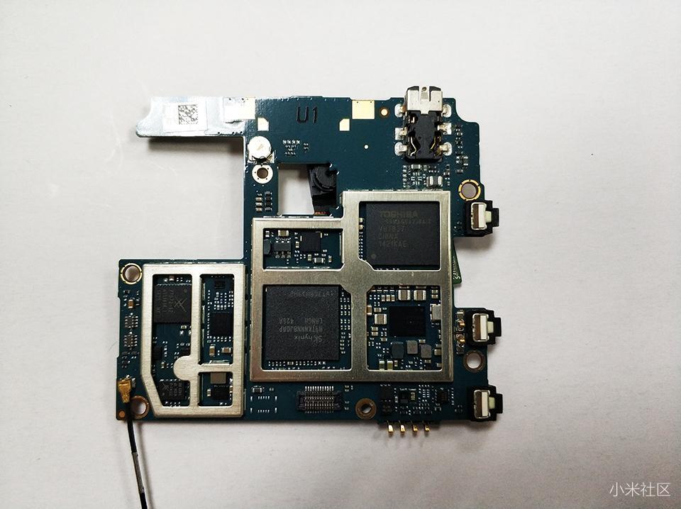 如上图可以看出,红米1S采用了上下分离两段式主板设计,首次采用了高通芯片都集成在机身顶部的电路板上,集成度还是很高的。