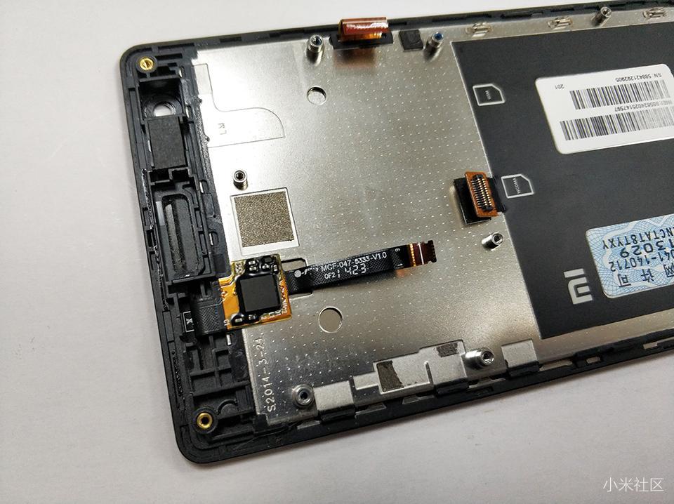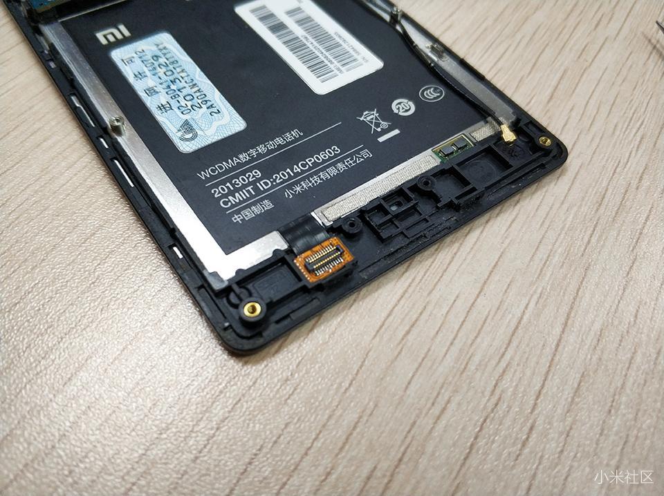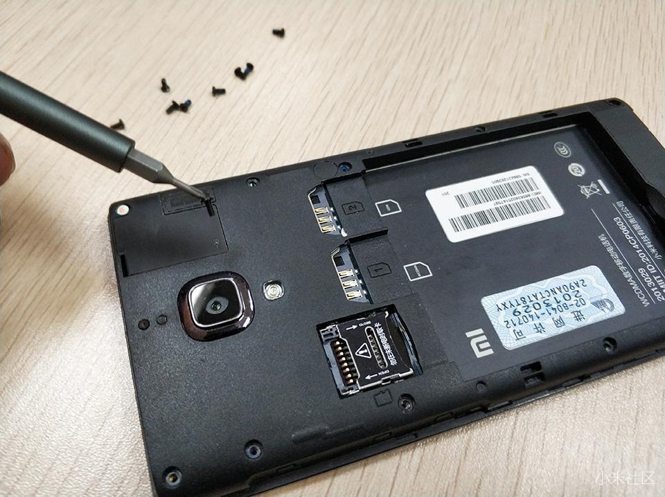 随着一个一个螺丝的拆卸掉,到最后左上角的螺丝,需要注意的是,这个是保修的一个标识,上面贴有易碎贴纸,来验证此红米手机有无被拆卸,自行拆解不享受保修政策。对于笔者这部红米1S,不会在意啦。