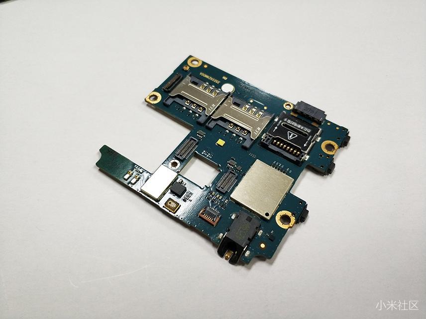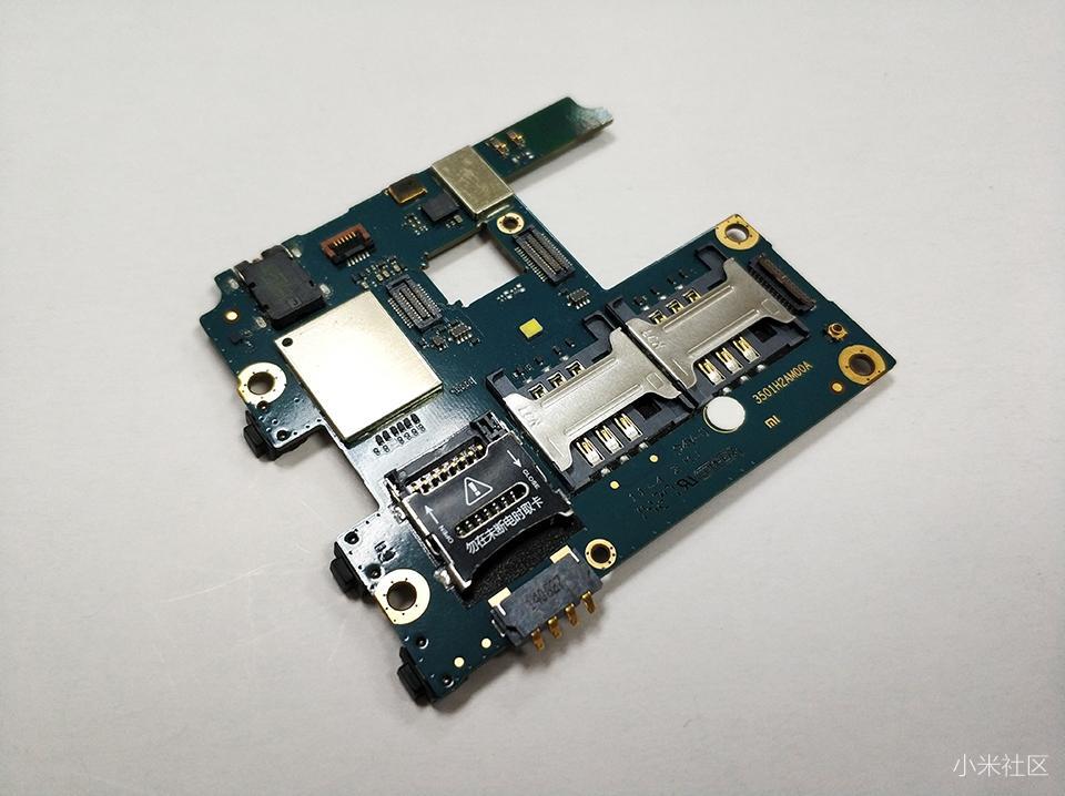 红米1S手机的核心就是在主板方面了,正面主要集成了双SIM卡槽、MicroSD卡扩展卡槽,还有降噪麦克风及耳机接口等。