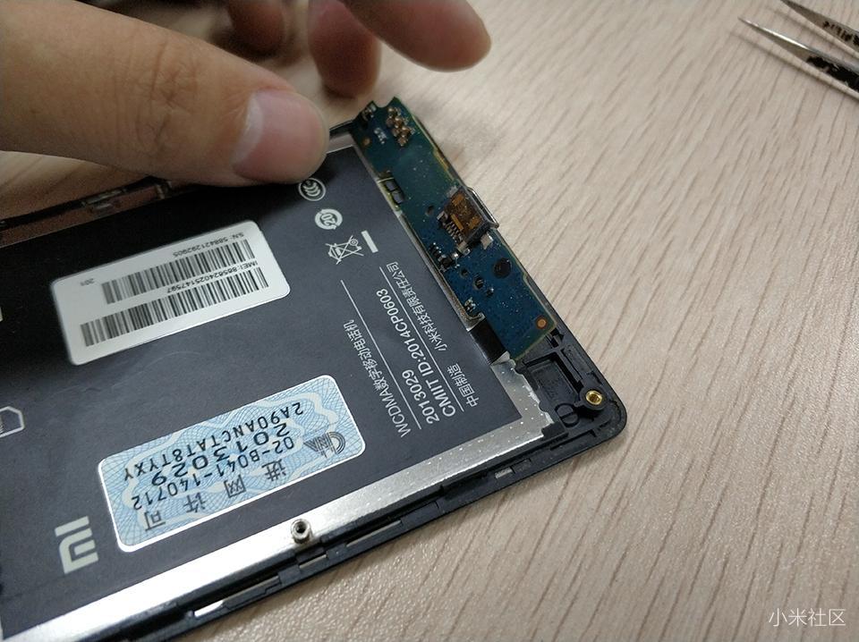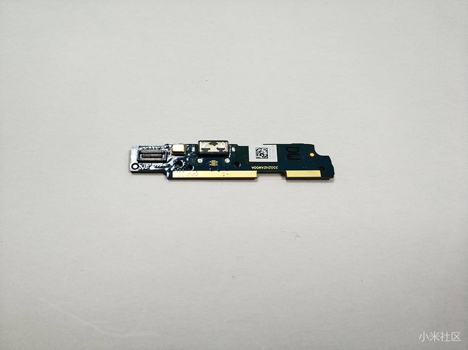 红米1S底部的也有一个主板,俗称小主板,主要集成了支持OTG功能与MicroUSB数据和充电完后、呼吸灯以及通话麦克风。拆卸的话需要用工具拧掉两颗螺丝。