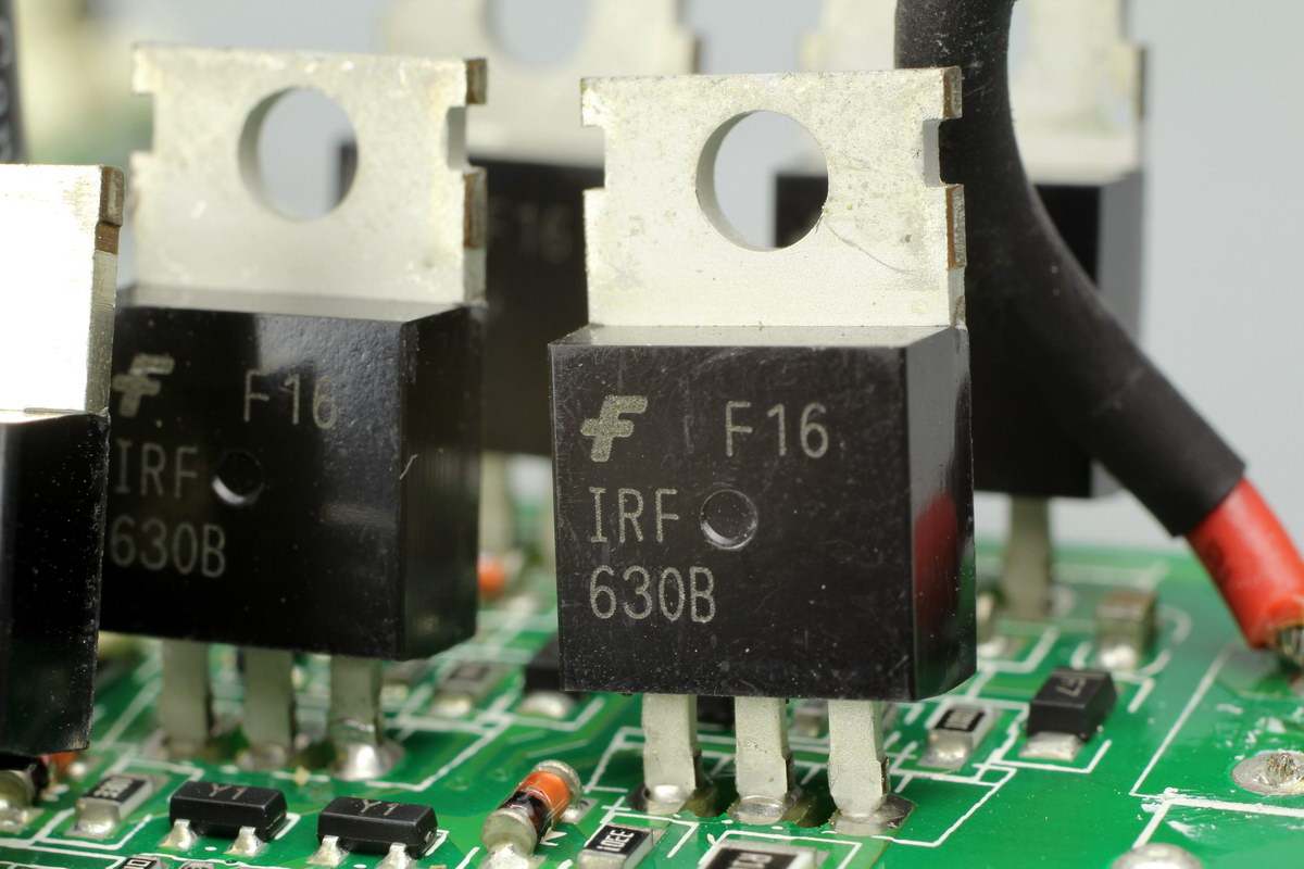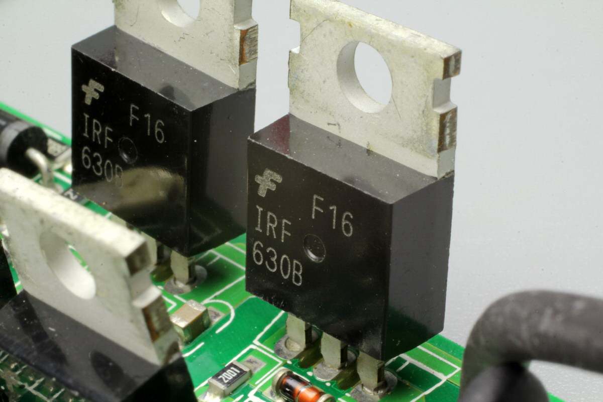 安森美IRF630B,NMOS管,耐压200V,导阻0.4Ω,TO-220封装,采用四颗用于输出调制。
