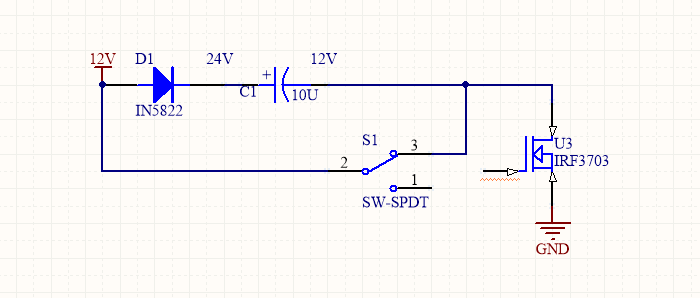 如下图所示当开关S1接3时MOS管导通此时C1负极与地相接电源通过D1、MOS管对电容进行充电当电路稳定之后电容正端电压对地为12V,负端对地电压为0V