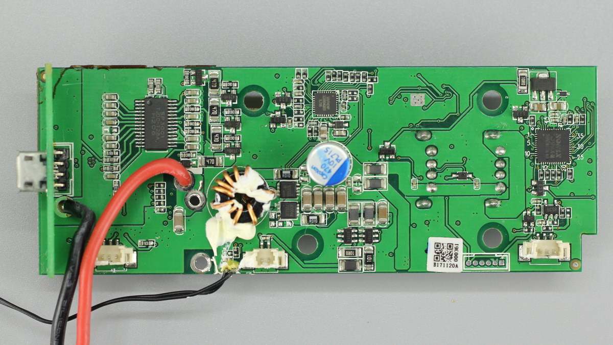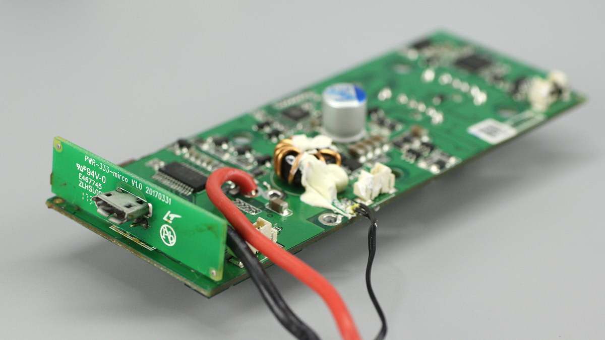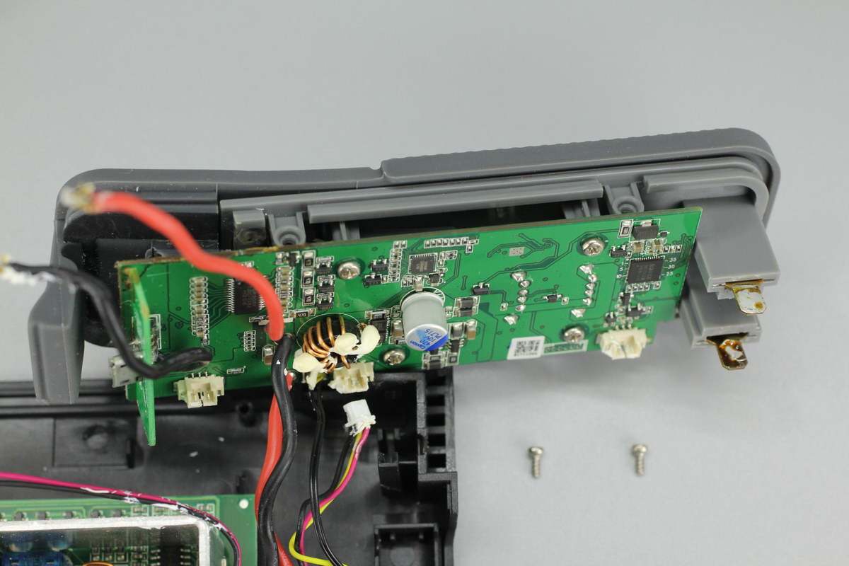 产品内部布局一览,右下角是电池组,左侧是L型PCB板,顶部还垂直放置一块PCB板,三者之间通过导线连接。