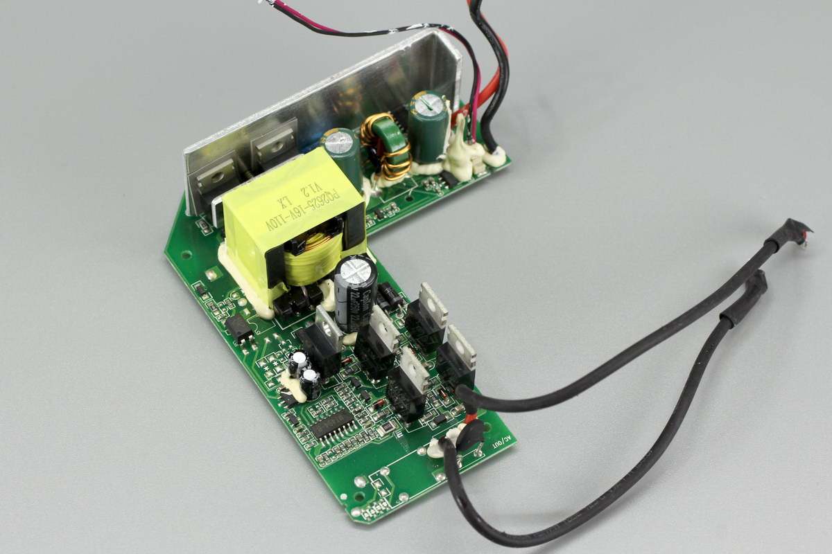 逆变器PCB板一侧设有散热片帮助MOS管散热,和AC插口连接的导线套有绝缘管。