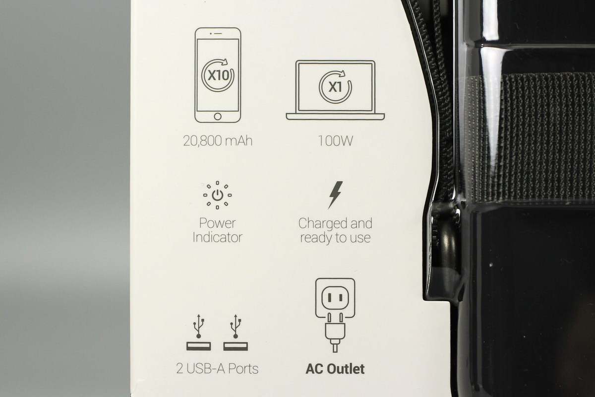 一侧印有20800mAh容量、100W快充、指示灯、USB口、AC插口等特性标识。