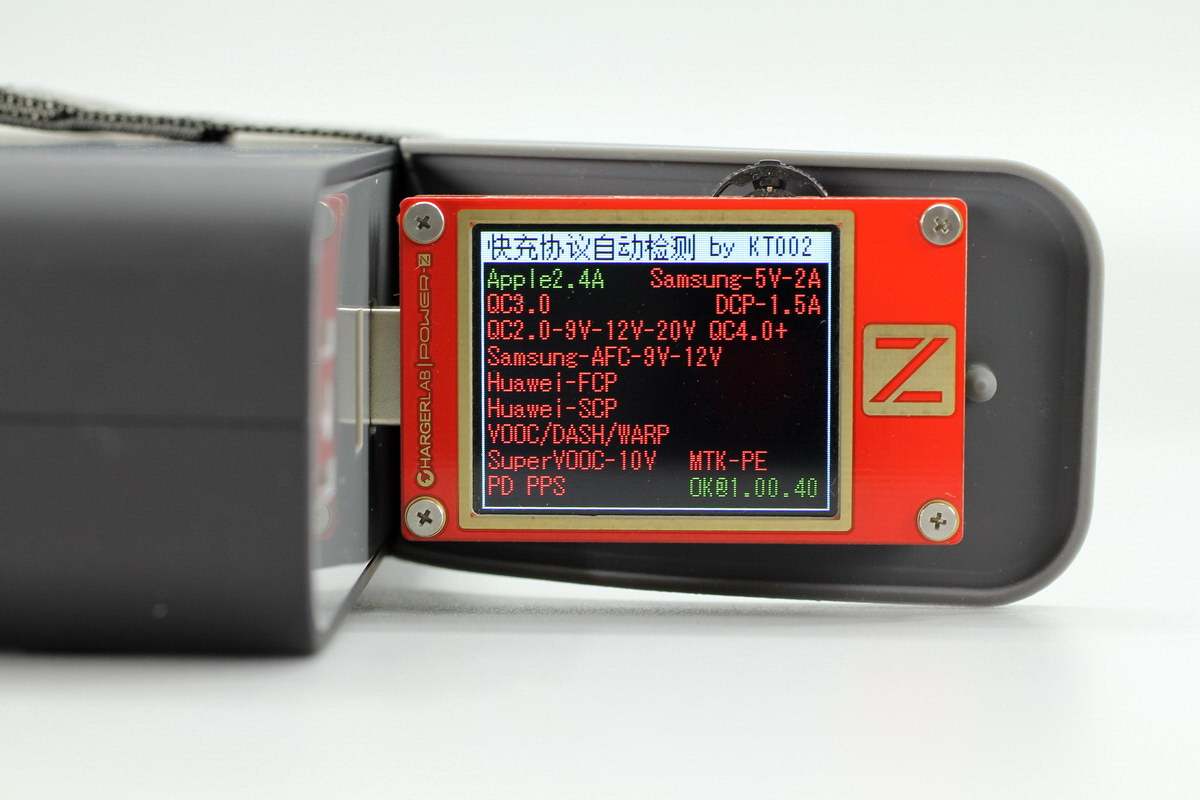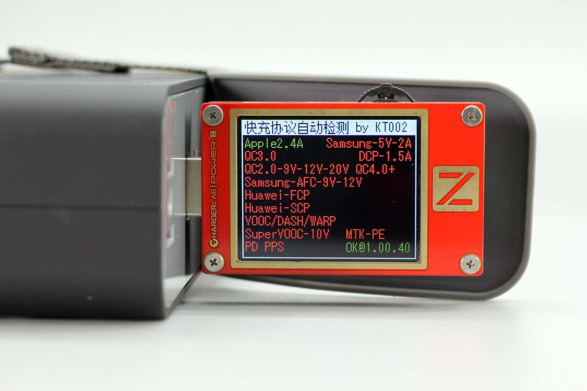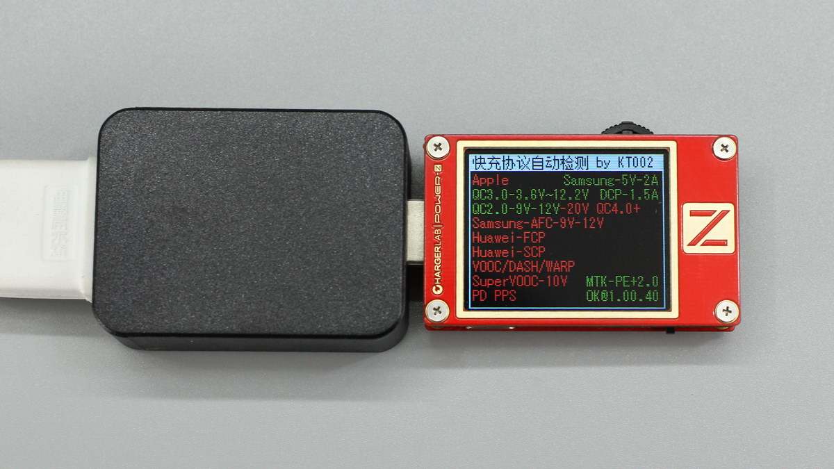 使用ChargerLAB POWER-Z KT002测得USB-A口支持QC2.0、QC3.0、PE2.0快充协议。