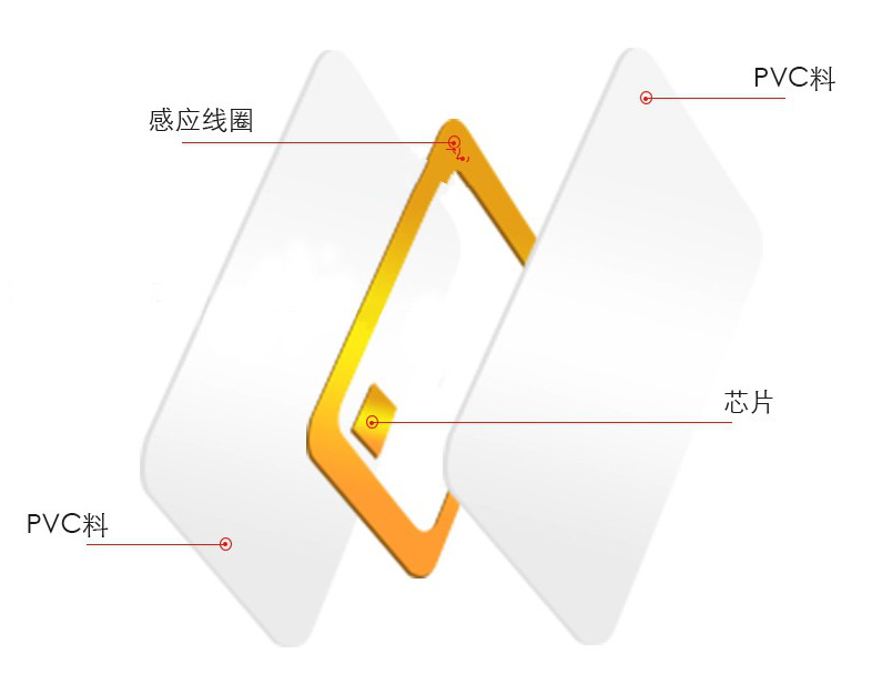 标准卡一般的内部结构为两层PVC料夹住感应线圈和微型芯片,微型芯片一般在一角,如下图。