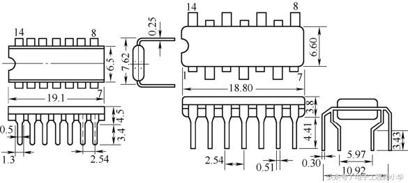顺便指出,有个别型号集成电路的引脚,在其对应位置上有缺脚(即无此输出引脚)。对这种型号的集成电路,其引脚编号顺序不受影响。
