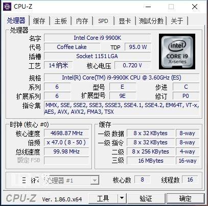 我们先来看下Intel Core i9-9900K的实际参数。Intel Core i9-9900K拥有8核心16线程的规格,16MB的L3缓存,基准频率3.6GHz,睿频可以达到4.7GHz,看起来参数十分地强悍,毕竟这一代可是采用了钎焊进行导热。