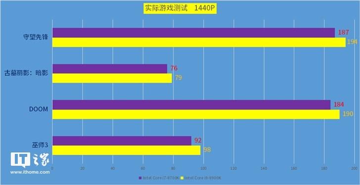 和理论测试相比,实际游戏就完全不是一个情况了,游戏帧率在1080Ti和2K的条件下,两者都没有拉开太大的距离,Intel Core i9-9900K仅仅比8700K提升了4-5帧,相比较也就是提升5%,毕竟现在的游戏瓶颈完全不在CPU,而是在GPU也就是显卡。换个好显卡远比CPU有效得多。