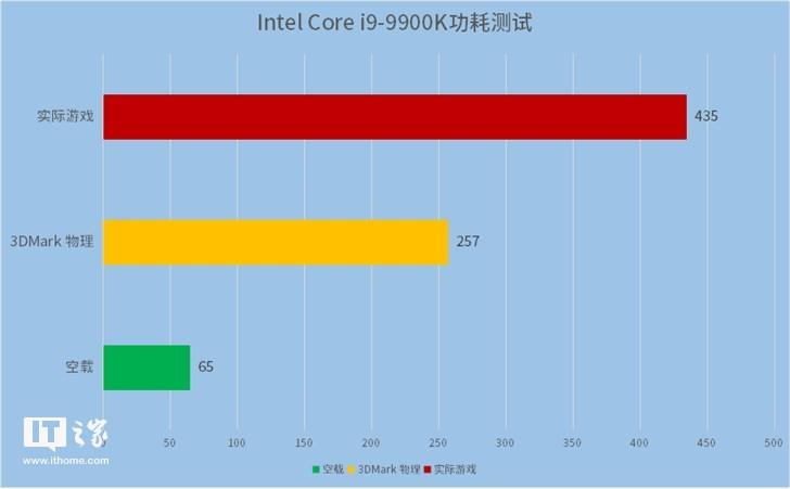 在使用功耗仪来测试9900K处理器在运行3DMark物理测试的时候,我被实际的功耗吓了一跳,因为经过我们的测试,这套系统在3DMark物理测试的时候达到了257W,而显卡的负载为5%,整套系统的空载仅为65W,也就是说其中相差的192W差不多都是CPU贡献的。而满载情况下也就是实际游戏,整机功耗更是达到了435W之巨,这个成绩十分地吓人,可见对于发烧级CPU来说,TDP完全不能当做参考,只能说电源真的是越大越好,尤其是这样的发烧级处理器。