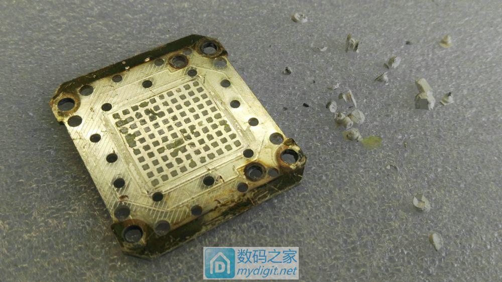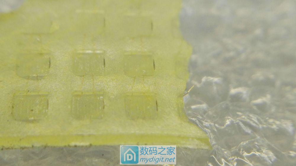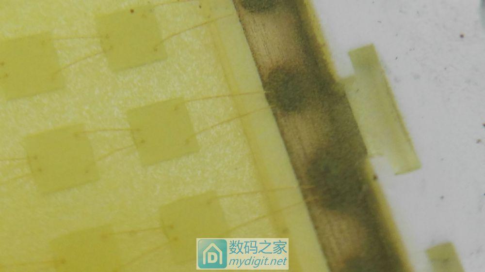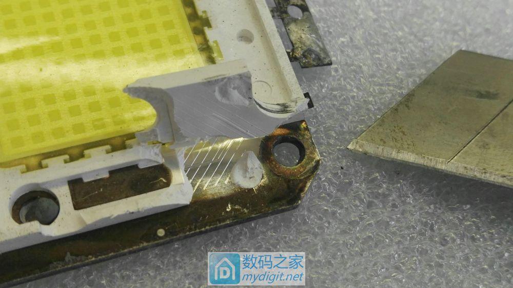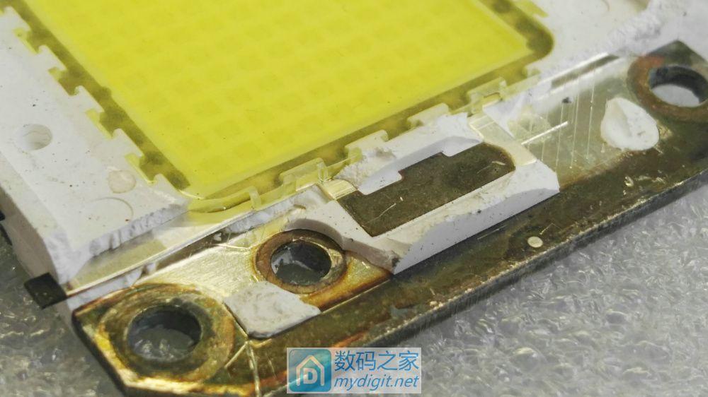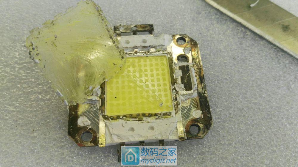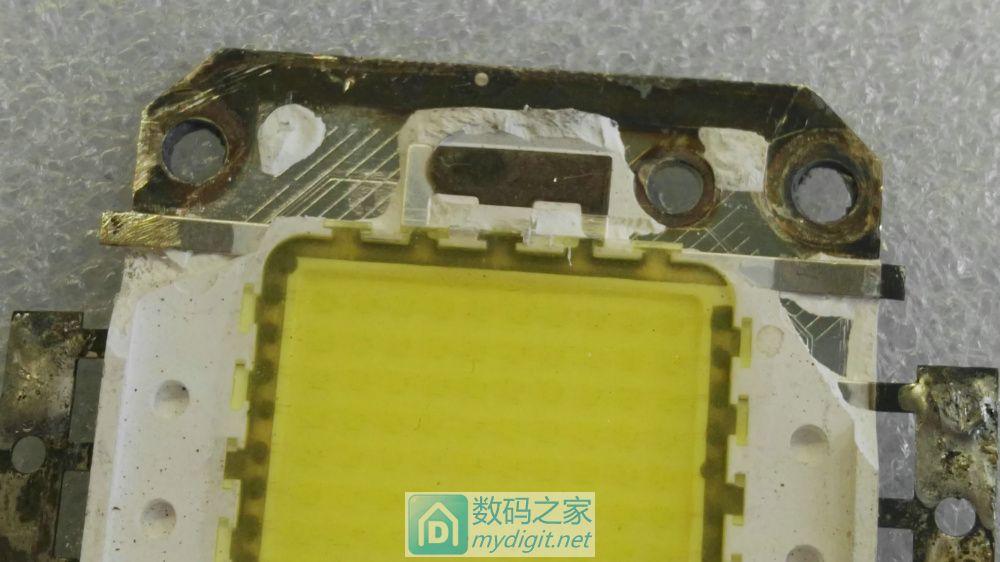 细看劈下来的硅胶(确切说是硅胶与荧光粉的混合物),留下一个个“小坑”和N多扯断的金丝。