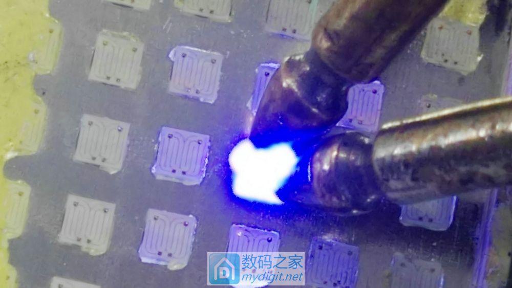 单颗芯片P N极用万用表二极管档能点亮,发出蓝光。