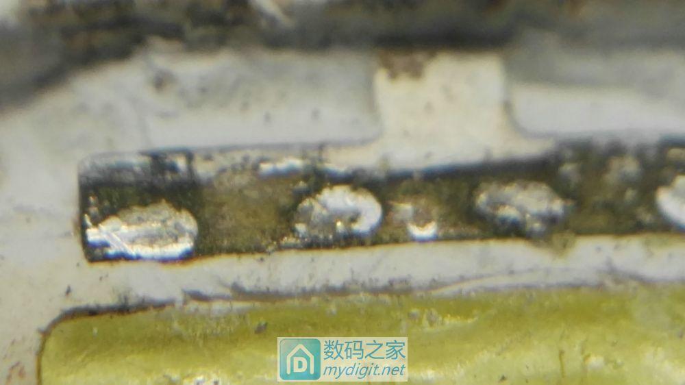支架上二次焊点特写。支架局部已经发黑,可能金属之间发生了迁移或者是银的硫化。