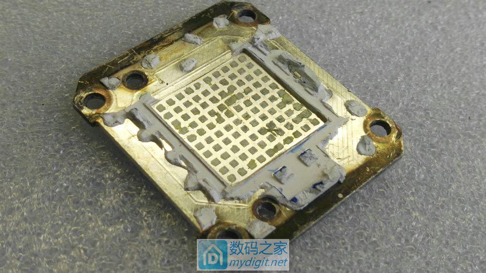 看这颗灯珠,铜基板底部因为有导热硅脂填充,基板与空气隔离,所以没有变色。与空气接触裸露的部分因灯珠发出高温,加速了其氧化发黑的速度。