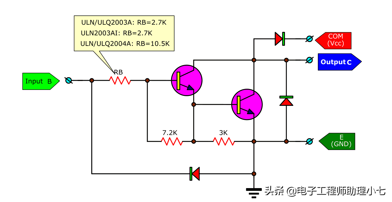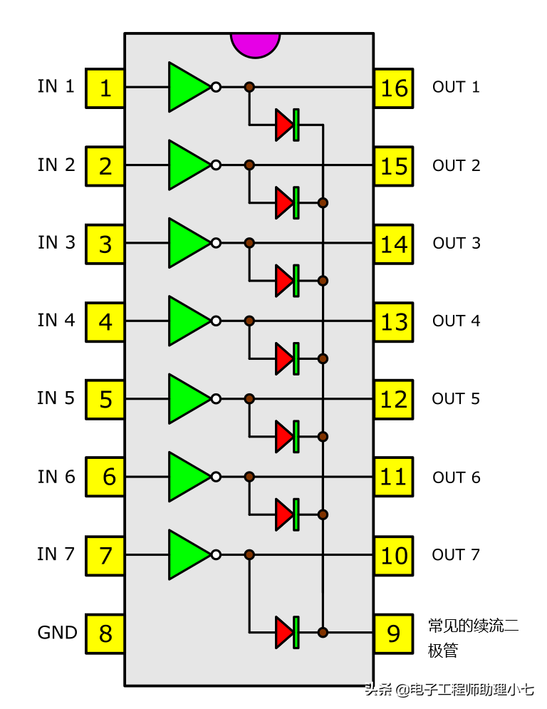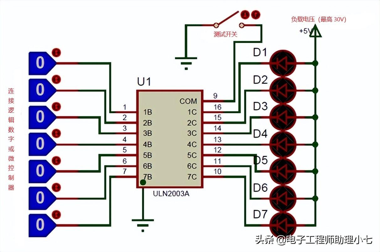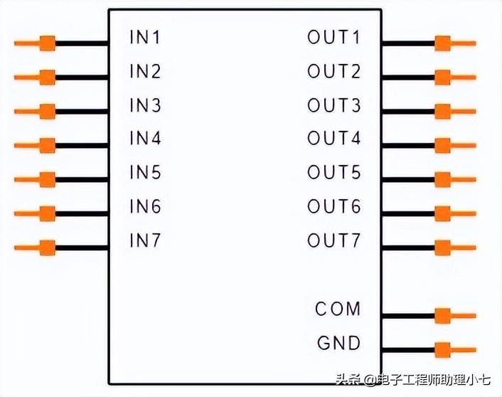我们知道 ULN IC 是达林顿对 IC 并且芯片上有晶体管 ,我们知道晶体管有 3 个端子,即基 极、发射极 、集电极 ,因此输入的基极 范围从1B 到 7B ,共发射极 接地到所有七个驱动 器和相应的集电极每个基本输入的输出 。+12V 到 COM 点用于保护电路免受反电动势影响的反激二极管 。