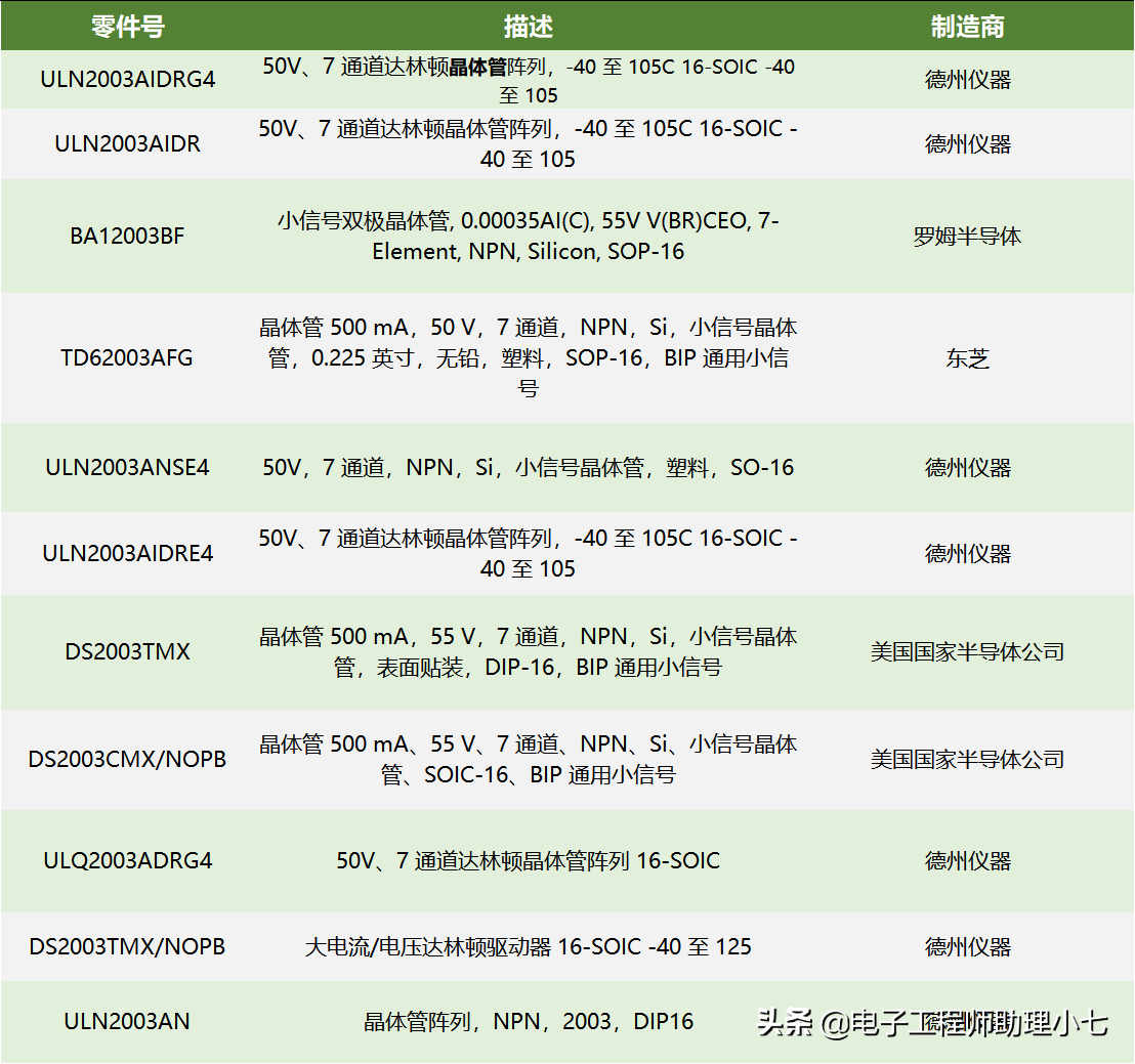 下面为 ULN2003A 替代品图 ,这里只是列举出来,大家在实际应用时,还需要考虑到引脚,封装和功能实现 。