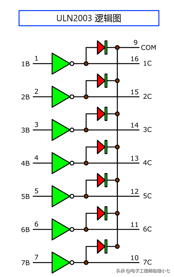 ULN2003A 具有续流二极管 ,可防止反电动势 。ULN2003A 逻辑图如下图所示: