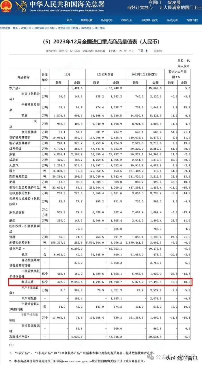 1月17日消息,据海关总署公布的最新数据显示,2023年全年中国集成电路进口数量为4795.6亿颗,同比减少10.8%,金额为24590.7亿元人民币,同比减少了10.6%。不过,进口金额如果以美元计,将是3490亿美元,与2022年相比大跌15.4%。