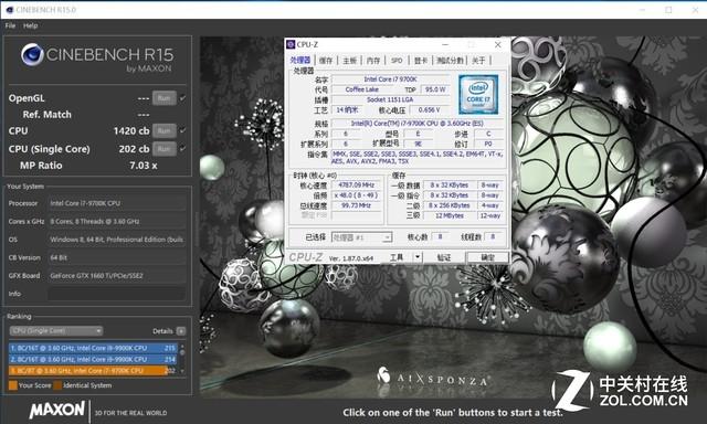 CINEBENCH是业界公认的基准测试软件,在国内外主流媒体的多数系统性能测试中都能看到它的身影。在多线程测试中i7-9700K得分为1420分,在单线程测试中为202分。