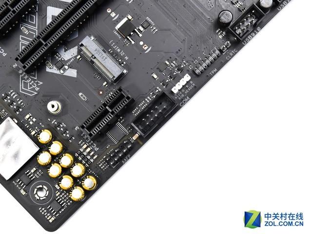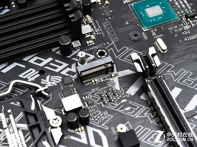 在显卡插槽周围是两个M.2接口(还有一个在南桥附近),上面的M.2接口有金属装甲保护的接口支持SATA转PCIe 3.0 x4 模式,两个都支持2242-2280长度NVME协议,而在普通PCI-E X16显卡插槽旁边的是一个WIFI拓展接口。