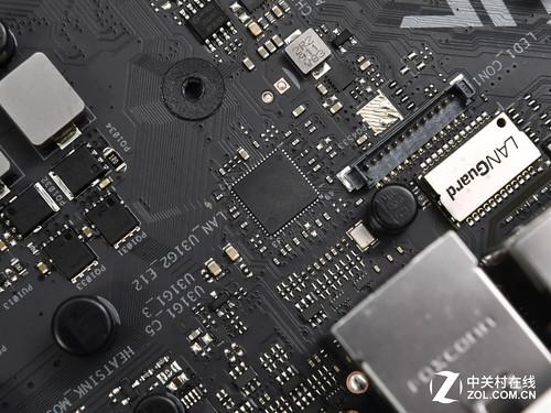 在I/O区域旁边是一块ASM3142 控制芯片, 用于对USB接口进行控制,旁边是LANGuard 网络波滤器,能有效的防止网络信号被干扰,对游戏玩家来说更具实用性。