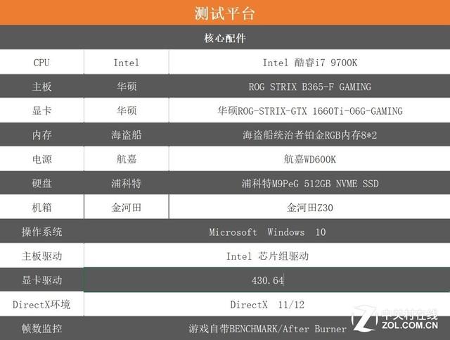 测试平台方面,CPU采用第九代Intel八核心八线程的i7-9700K、主板为ROG STRIX B365-F GAMING,显卡为ROG-STRIX-GTX 1660Ti-O6G-GAMING、海盗船统治者铂金DDR4 ×2内存、电源为航嘉WD600K、机箱为金河田峥嵘Z30。