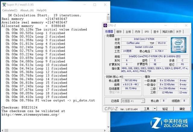 SuperPI是一款计算圆周率的软件,i7-9700K在SuperPI得分是8.786s,SuperPI成绩越小单核性能越强。