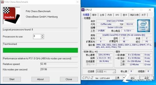 FritzChessBenchmark得分是25196,说明这款主板上i7-9700K多线程大规模科学运算能力没有问题。