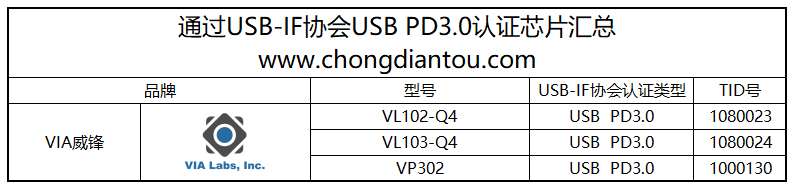 目前,威锋电子VL102‐Q4、VL103‐Q4、VP302三款芯片已经通过了USB-IF协会的USB PD3.0认证。
