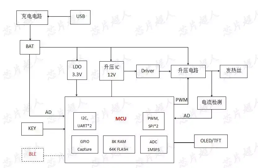 上面是电池及充电管理部分,电池通过LDO给主控芯片供电。如图所示框中为MCU,外接开关机、功率调整等按键,MCU可以根据客户的需求,选择匹配OLED屏或者TFT屏,屏显内容可自定义。MCU输出PWM控制升压部分,后面负载为发热丝。