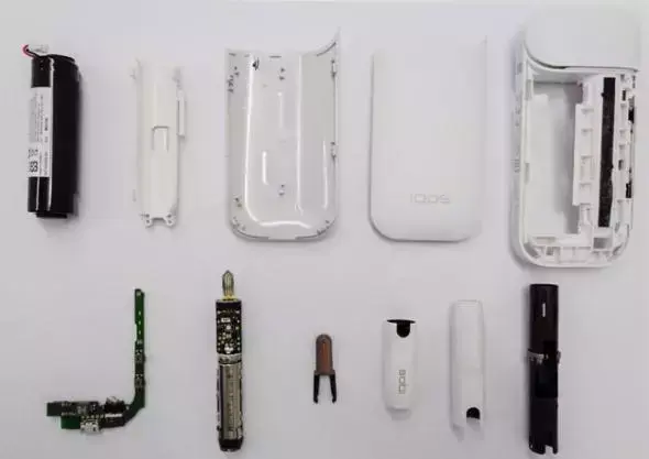 这款电子烟工作原理是将烟弹插入加热杆,通过大约300度烘烤烟丝,蒸发出尼古丁以及香料。以得到与抽真烟类似的口感。我们可以看到IQOS产品拆解后的示意图,包含电池盒的低壳,上盖,烟杆的外壳,按键,及充电盒的PCBA等,IQOS充电盒内置一颗2900mA电池给烟杆进行充电,烟杆每抽一根烟弹需要进行充电,每一根烟弹大概吸食12~14口。