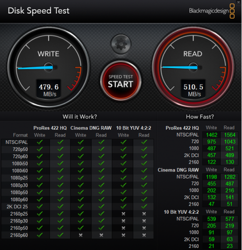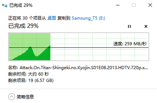 软件显示,T5的写入速度为479.6MB/s,读取速度为510.5MB/s,考虑到系统、接口的差别,实际测试结果和宣传的相差无几。传输一组9.35G的视频文件,从电脑到硬盘和从硬盘到电脑大概都只需25秒左右。