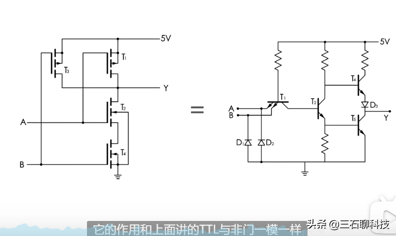 两个三级晶体管逻辑门是在集成电路上的基本组件。简单的逻辑门可由晶体管组成。这些晶体管的组合可以使代表两种信号的高低电平在通过它们之后产生高电平或者...
