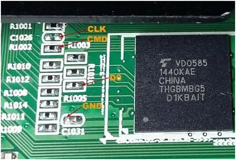 如果您已经有了线路板相应的飞线点位图,只需要按图示用飞线CMD、CLK、D0、GND到编程器相应接口,特别注意飞线不宜过长,在10CM以内最好,减少损耗和干扰以保障读写成功率。然后断开点位处与其它线路相连的电阻,断电阻的目的是避免其它线路对数据读写产生影响,飞线让编程器直接与eMMC芯片相关引脚相连。接下来还需要将主芯片晶振短接到地,让主芯片停止工作,避免干扰与影响。最后给主板通电,这样前面提到的eMMC芯片的VCC和VCCQ都会直接由主板电源供电。如果以上操作无误,我们在软件界面输入eMMC_AUTO_ISP会识别到eMMC芯片的ID和相关参数,就可以正常操作读取或写入。假如您没有点位图和主板的图纸,也可以拆下eMMC芯片根据引脚在PCB板的位置找到对应的点位,再焊回eMMC芯片按上述方法飞线后再操作读写即可。