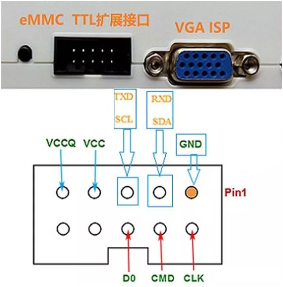 如果没有这些条件,可以按以下方法查找:在eMMC芯片附近查看整排的0到数十欧电阻和信号线。CLK在PCB上有特征,通常有一个串联的小电阻,部分板子还有个空的电容焊盘,一般没有上拉电阻。CLK在eMMC上电初始化时就有几百KHZ的时钟信号出现,有数据通讯时则会出现数十M的时钟信号,用示波器或者频率计可以看出来;CMD/D0一般都有上拉电阻,CMD在eMMC上电初始化时就有几百KHZ的数据波形出现,用示波器或者频率计可以看出来;而D0在初始化时没有那么多的数据波形,这些信号里也就D0稍微难找一点。一般在数据口8个上拉电阻的最边上,多试几次就行部分板卡的3.3V供电不仅要供给eMMC,同时还供给了其他芯片,耗电量较大时,请使用原机的3.3V或者外接3.3V单独供电,这点与手机等低功耗产品有一些不同。