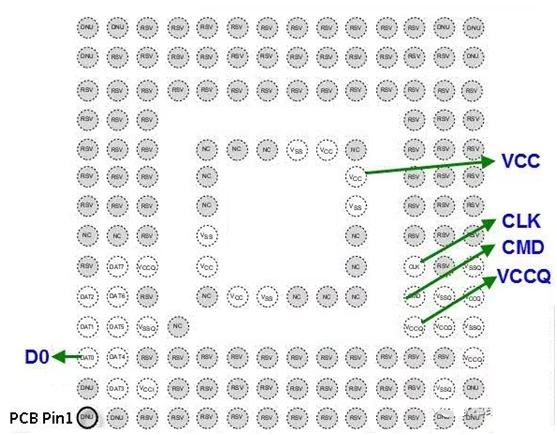 前段时间有粉丝一直分不清eMMC脚位,今天宏旺半导体和大家详细聊聊,在eMMC改U盘或需要更新替换、在线读写时,都需要弄清eMMC的脚位,这篇文章就和大家分享如何找到这些脚位。我们知道eMMC芯片的读写需要用到的脚位是:VCC(或VDD)、VCCQ(或VDDF)、CMD、CLK、VSS(或GND)以及DAT0、DAT1、DAT2、DAT3、DAT4、DAT5、DAT6、DAT7数据接口。eMMC在线读写需要找到VCC/GND/CLK/CMD/D0至少5根线,VCC/GND这个最好找,不用多讲。如果有图纸或者拆了eMMC的PCB,都可以轻松找到飞线点。