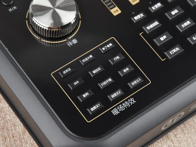 森然ST60直播调音台声卡的顶部共有两个大旋钮和六个小旋钮,两个大旋钮分别控制伴奏音量、话筒音量,中间六个小旋钮分别可以控制混响、监听、录音、均衡、乐器、电音大小。对于主播而言,最顶部的一排小旋钮一般需要在直播前调整到自己满意的程度,在直播过程中几乎不会去再做调整;伴奏、话筒音量两个大旋钮则相反:因为伴奏随音乐不同可能需要调节音量、话筒随主播当前需求调节音量,将这两个常使用的旋钮放大的设计不仅方便操作,更大的半径也是用户可以更好的对声音进行微调。用户也可使用森然官方驱动来实现软件控制。