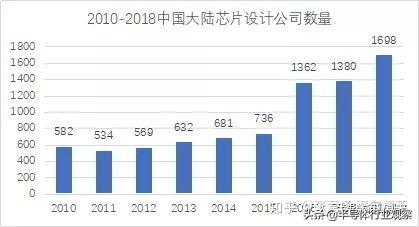 从2010年到2018年,设计公司数量从582家增加到1698家,数量增长近3倍。2010年到2015年5年间只增加了154家,但2016年比2015年增加了626家,数量是2015年的近一倍,这个增长来自国家政策的刺激,中国国务院于2015年3月发起“2025年中国制造”(MIC 2025)计划,促进芯片设计公司遍地开花。2017年芯片设计公司数量与2016年相当,但随着中兴事件的爆发,资本再一次集中进入芯片行业,2018年迎来了大量新的芯片设计公司,比2017年增加了318家。