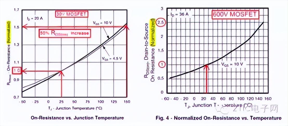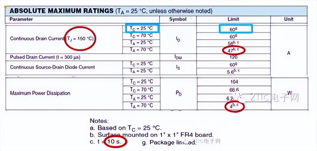 图1 RDS(on)在最高工作温度的30%~150%这个范围内随温度增加而增加 导通电阻对N沟道和P沟道MOSFET都是十分重要的。在开关电源中,Qg是用在开关电源里的N沟道MOSFET的关键选择标准,因为Qg会影响开关损耗。这些损耗有两个方面影响:一个是影响MOSFET导通和关闭的转换时间;另一个是每次开关过程中对栅极电容充电所需的能量。要牢记的一点是,Qg取决于栅源电压,即使用更低的Vgs可以减少开关损耗。 作为一种快速比较准备用在开关应用里MOSFET的方式,设计者经常使用一个单数公式,公式包括表示传导损耗RDS(on)及表示开关损耗的Qg:RDS(on) xQg。这个“优值系数”(FOM)总结了器件的性能,可以用典型值或最大值来比较MOSFET。要保证在器件中进行准确的比较,你需要确定用于RDS(on) 和Qg的是相同的VGS,在公示里典型值和最大值没有碰巧混在一起。较低的FOM能让你在开关应用里获得更好的性能,但是不能保证这一点。只有在实际的电路里才能获得最好的比较结果,在某些情况下可能需要针对每个MOSFET对电路进行微调。 额定电流和功率耗散 基于不同的测试条件,大多数MOSFET在数据表里都有一个或多个的连续漏极电流。你要仔细看看数据表,搞清楚这个额定值是在指定的外壳温度下(比如TC = 25℃),或是环境温度(比如TA = 25℃)。这些数值当中哪些是最相关将取决于器件的特性和应用(见图2)。