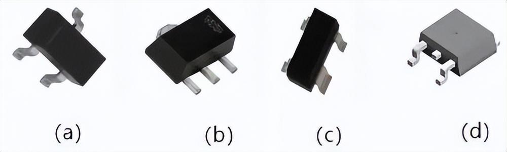 SOT封装类型 SOT23是常用的三极管封装形式,有3条翼形引脚,分别为集电极、发射极和基极,分别列于元件长边两侧,其中,发射极和基极在同一侧,常见于小功率晶体管、场效应管和带电阻网络的复合晶体管,强度好,但可焊性差,外形如下图(a)所示。 SOT89具有3条短引脚,分布在晶体管的一侧,另外一侧为金属散热片,与基极相连,以增加散热能力,常见于硅功率表面组装晶体管,适用于较高功率的场合,外形如下图(b)所示。 SOT143具有4条翼形短引脚,从两侧引出,引脚中宽度偏大的一端为集电极,这类封装常见于高频晶体管,外形如下图(c)所示。 SOT252属于大功率晶体管,3条引脚从一侧引出,中间一条引脚较短,为集电极,与另一端较大的引脚相连,该引脚为散热作用的铜片,外形如下图(d)所示。