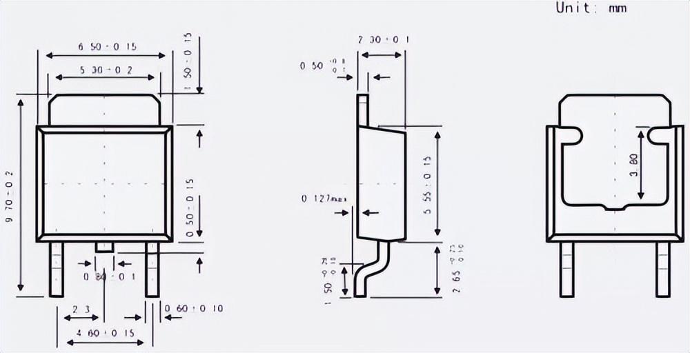 TO封装产品外观 TO252/D-PAK是一种塑封贴片封装,常用于功率晶体管、稳压芯片的封装,是目前主流封装之一。 采用该封装方式的MOSFET有3个电极,栅极(G)、漏极(D)、源极(S)。 其中漏极(D)的引脚被剪断不用,而是使用背面的散热板作漏极(D),直接焊接在PCB上,一方面用于输出大电流,一方面通过PCB散热;所以PCB的D-PAK焊盘有三处,漏极(D)焊盘较大。其封装规范如下: