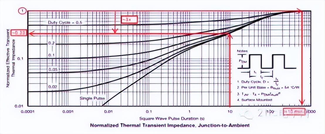 图2 全部绝对最大电流和功率数值都是真实的数据 对于用在手持设备里的小型表面贴装器件,关联度最高的电流等级可能是在70℃环境温度下的电流,对于有散热片和强制风冷的大型设备,在TA = 25℃下的电流等级可能更接近实际情况。对于某些器件来说,管芯在其最高结温下能够处理的电流要高于封装所限定的电流水平,在一些数据表,这种“管芯限定”的电流等级是对“封装限定”电流等级的额外补充信息,可以让你了解管芯的鲁棒性。 对于连续的功率耗散也要考虑类似的情况,功耗耗散不仅取决于温度,而且取决于导通时间。设想一个器件在TA= 70℃情况下,以PD=4W连续工作10秒钟。构成“连续”时间周期的因素会根据MOSFET封装而变化,所以你要使用数据表里的标准化热瞬态阻抗图,看经过10秒、100秒或10分钟后的功率耗散是什么样的。如图3所示,这个专用器件经过10秒脉冲后的热阻系数大约是0.33,这意味着经过大约10分钟后,一旦封装达到热饱和,器件的散热能力只有1.33W而不是4W,尽管在良好冷却的情况下器件的散热能力可以达到2W左右。