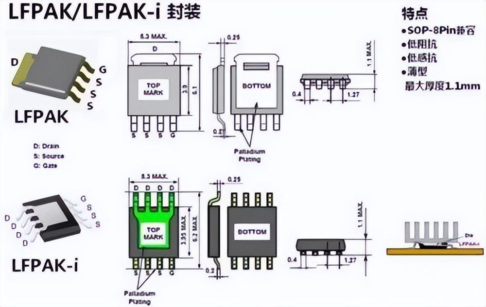 瑞萨 LFPAK和LFPAK-I封装 2、威世(Vishay)Power-PAK和Polar-PAK封装 Power-PAK是威世公司注册的MOSFET封装名称。Power-PAK包括有Power-PAK1212-8、Power-PAK SO-8两种规格。 威世Power-PAK1212-8封装 威世Power-PAK SO-8封装 Polar PAK是双面散热的小形封装,也是威世核心封装技术之一。Polar PAK与普通的so-8封装相同,其在封装的上、下两面均设计了散热点,封装内部不易蓄热,能够将工作电流的电流密度提高至SO-8的2倍。目前威世已向意法半导体公司提供Polar PAK技术授权。 威世Polar PAK封装 3、安森美(Onsemi)SO-8和WDFN8扁平引脚(Flat Lead)封装 安美森半导体开发了2种扁平引脚的MOSFET,其中SO-8兼容的扁平引脚被很多板卡采用。安森美新近推出的NVMx和NVTx功率MOSFET就采用了紧凑型DFN5(SO-8FL)和WDFN8封装,可最大限度地降低导通损耗,另外还具有低QG和电容,可将驱动器损耗降到最低的特性。 安森美SO-8扁平引脚封装 安森美WDFN8封装 4、恩智浦(NXP)LFPAK和QLPAK封装 恩智浦(原Philps)对SO-8封装技术改进为LFPAK和QLPAK。其中LFPAK被认为是世界上高度可靠的功率SO-8封装;而QLPAK具有体积小、散热效率更高的特点,与普通SO-8相比,QLPAK占用PCB板的面积为6*5mm,同时热阻为1.5k/W。 恩智浦LFPAK封装 恩智浦QLPAK封装 5、意法(ST)半导体PowerSO-8封装 意法半导体功率MOSFET芯片封装技术有SO-8、PowerSO-8、PowerFLAT、DirectFET、PolarPAK等,其中PowerSO-8正是SO-8的改进版,此外还有PowerSO-10、PowerSO-20、TO-220FP、H²PAK-2等封装。 意法半导体Power SO-8封装 6、飞兆(Fairchild)半导体Power 56封装 Power 56是Farichild的专用称呼,正式名称为DFN 5×6。其封装面积跟常用的TSOP-8不相上下,而薄型封装又节约元件净空高度,底部Thermal-Pad设计降低了热阻,因此很多功率器件厂商都部署了DFN 5×6。 Fairchild Power 56封装 7、国际整流器(IR)Direct FET封装 Direct FET能在SO-8或更小占位面积上,提供高效的上部散热,适用于计算机、笔记本电脑、电信和消费电子设备的AC-DC及DC-DC功率转换应用。与标准塑料分立封装相比,DirectFET的金属罐构造具有双面散热功能,因而可有效将高频DC-DC降压式转换器的电流处理能力增加一倍。 Direct FET封装属于反装型,漏极(D)的散热板朝上,并覆盖金属外壳,通过金属外壳散热。Direct FET封装极大地改善了散热,并且占用空间更小,散热良好。 国际整流器Direct FET封装 IR Direct FET封装系列部分产品规格 内部封装改进方向 除了外部封装,基于电子制造对MOS管的需求的变化,内部封装技术也在不断得到改进,这主要从三个方面进行:改进封装内部的互连技术、增加漏极散热板、改变散热的热传导方向。 1、封装内部的互连技术 TO、D-PAK、SOT、SOP等采用焊线式的内部互连封装技术,当CPU或GPU供电发展到低电压、大电流时代,焊线式的SO-8封装就受到了封装电阻、封装电感、PN结到PCB和外壳热阻等因素的限制。 SO-8内部封装结构 这四种限制对其电学和热学性能有着极大的影响。随着电流密度的提高,MOSFET厂商在采用SO-8尺寸规格时,同步对焊线互连形式进行了改进,用金属带、或金属夹板代替焊线,以降低封装电阻、电感和热阻。 标准型SO-8与无导线SO-8封装对比 国际整流器(IR)的改进技术称之为Copper Strap;威世(Vishay)称之为Power Connect技术;飞兆半导体则叫做Wireless Package。新技术采用铜带取代焊线后,热阻降低了10-20%,源极至封装的电阻降低了61%。 国际整流器的Copper Strap技术 威世的Power Connect技术 飞兆半导体的Wirless Package技术 2、增加漏极散热板 标准的SO-8封装采用塑料将芯片包围,低热阻的热传导通路只是芯片到PCB的引脚。而底部紧贴PCB的塑料外壳是热的不良导体,故而影响了漏极的散热。 技术改进就是要除去引线框下方的塑封化合物,方法是让引线框金属结构直接或加一层金属板与PCB接触,并焊接到PCB焊盘上,这样就提供了更多的散热接触面积,把热量从芯片上带走;同时也可以制成更薄的器件。 威世Power-PAK技术 威世的Power-PAK、法意半导体的Power SO-8、安美森半导体的SO-8 Flat Lead、瑞萨的WPAK/LFPAK、飞兆半导体的Power 56和Bottomless Package都采用了此散热技术。 3、改变散热的热传导方向 Power-PAK的封装虽然显著减小了芯片到PCB的热阻,但当电流需求继续增大时,PCB同时会出现热饱和现象。所以散热技术的进一步改进就是改变散热方向,让芯片的热量传导到散热器而不是PCB。 瑞萨LFPAK-i封装 瑞萨的LFPAK-I封装、国际整流器的Direct FET封装均是这种散热技术的典型代表。 总结 未来,随着电子制造业继续朝着超薄、小型化、低电压、大电流方向的发展,MOS管的外形及内部封装结构也会随之改变,以更好适应制造业的发展需求。另外,为降低电子制造商的选用门槛,MOS管向模块化、系统级封装方向发展的趋势也将越来越明显,产品将从性能、成本等多维度协调发展。 而封装作为MOS管选型的重要参考因素之一,不同的电子产品有不同的电性要求,不同的安装环境也需要匹配的尺寸规格来满足。实际选用中,应在大原则下,根据实际需求情况来做抉择。 有些电子系统受制于PCB的尺寸和内部的高度,如通信系统的模块电源由于高度的限制通常采用DFN5*6、DFN3*3的封装;在有些ACDC的电源中,使用超薄设计或由于外壳的限制,适于装配TO220封装的功率MOS管,此时引脚可直接插到根部,而不适于使用TO247封装的产品;也有些超薄设计需要将器件管脚折弯平放,这会加大MOS管选用的复杂度。05如何选取MOSFET 一位工程