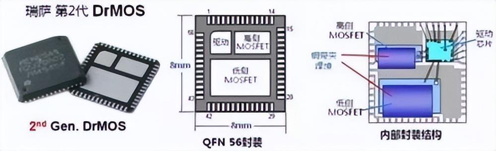 采用QFN-56封装的DrMOS 传统的分立式DC/DC降压开关电源无法满足对更高功耗密度的要求,也不能解决高开关频率下的寄生参数影响问题。 随着技术的革新与进步,把驱动器和MOSFET整合在一起,构建多芯片模块已经成为了现实,这种整合方式同时可以节省相当可观的空间从而提升功耗密度,通过对驱动器和MOS管的优化提高电能效率和优质DC电流,这就是整合驱动IC的DrMOS。