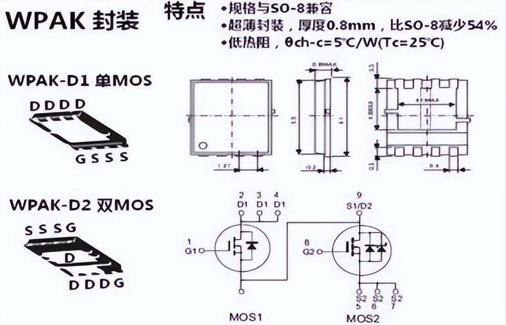 PLCC封装样式 主流企业的封装与改进 由于CPU的低电压、大电流的发展趋势,对MOSFET提出输出电流大,导通电阻低,发热量低散热快,体积小的要求。MOSFET厂商除了改进芯片生产技术和工艺外,也不断改进封装技术,在与标准外形规格兼容的基础上,提出新的封装外形,并为自己研发的新封装注册商标名称。 1、瑞萨(RENESAS)WPAK、LFPAK和LFPAK-I封装 WPAK是瑞萨开发的一种高热辐射封装,通过仿D-PAK封装那样把芯片散热板焊接在主板上,通过主板散热,使小形封装的WPAK也可以达到D-PAK的输出电流。WPAK-D2封装了高/低2颗MOSFET,减小布线电感。
