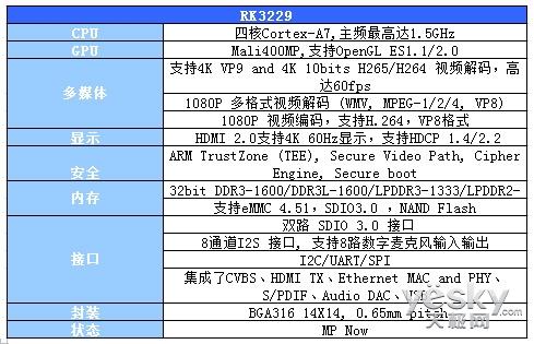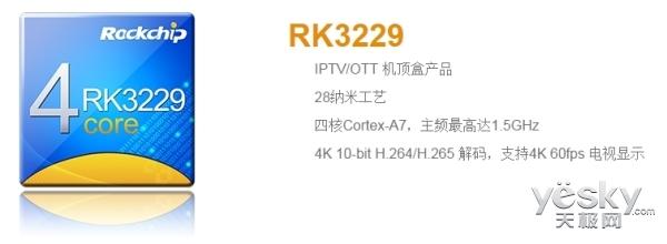 今天小编要给大家介绍的一款支持超高清蓝光标准的芯片出自瑞芯微RK3229,从整体上而言,性能定位中端,主要用于IPTV/OTT机顶盒产品,采用28纳米工艺,拥有四核Cortex-A7,主频最高可达1.5GHz,支持4K 10Bit H.264/h.265解码,支持4K 60fps电视显示,虽然在官方资料上并未有明确标识,但是在后续的测试中对于HDR影片也是支持的,因此也纳入超高清蓝光行列,下面给出具体的参数供大家参考: