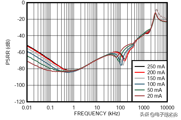 PSRR是许多LDO稳压芯片数据手册中的公共技术要求,有些手册里可能未列出该参数。它规定了某个频率的AC元件从输入到LDO输出的衰减程度,通俗的讲,是指LDO输出对输入纹波噪声的抑制作用,这也是很多场合在DC/DC后级另加一颗LDO的原因(特别是后面接模拟传感器或者ADC/DAC时)。高PSRR的LDO对输出纹波的抑制效果还是很明显的。下图是某器件厂家给的PSRR特征图。如何判断LDO的PSRR参数是否足够呢,举个简单的例子,假设LDO前面的DC/DC的开关频率是100khz,通过该器件得PSRR特征图得知,100khz处的PSRR是50dB,假设前端DC/DC 纹波大小100mv,那LDO之后的纹波=100mv/10(50/20)=0.3mv,可见高PSRR特性的LDO稳压芯片是多么重要。