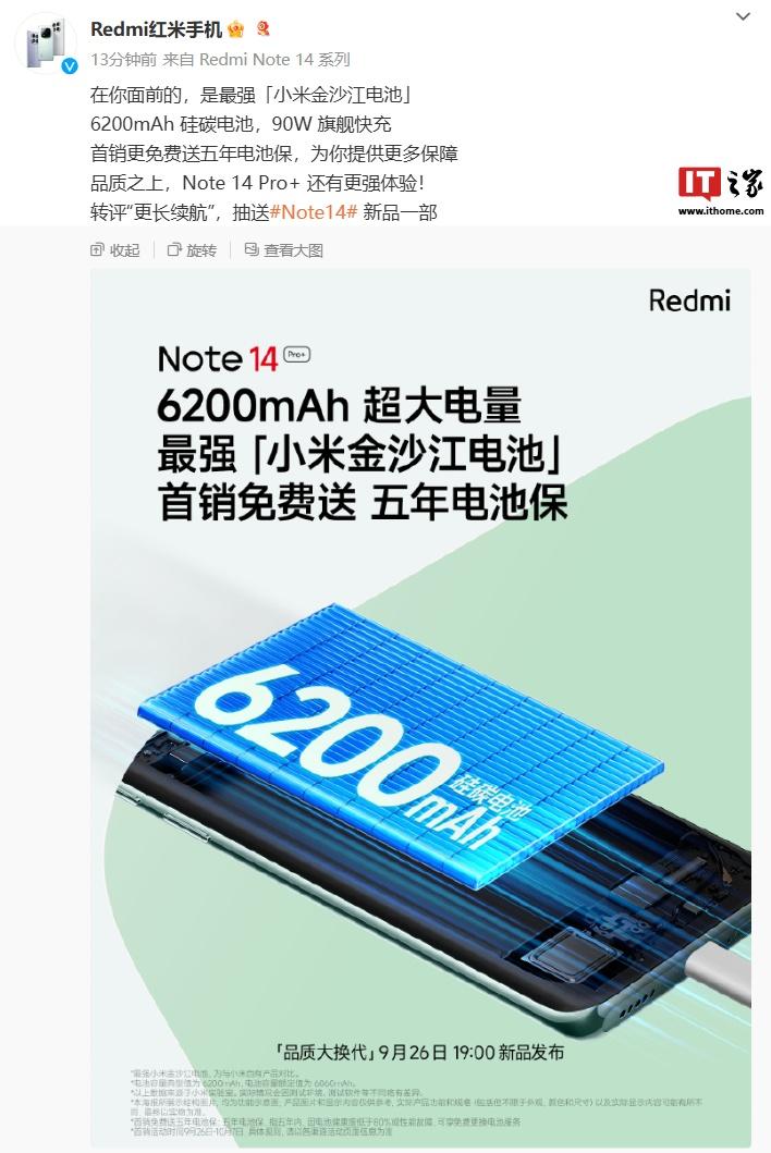 IT之家今日早些报道,小米 Redmi Note 14 Pro+ 手机将配备 6200mAh 硅碳电池 ,能量密度 814Wh / L,号称“最强小米金沙江电池”。同时该手机还支持 90W 快充 ,首销免费送五年电池保。