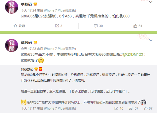 【手机中国 新闻】昨日网友@草图君透露了骁龙660处理器的一些进展,并称这款处理器价格好、功耗很好、进度很好、性能也很好,是一款很成功的产品。此外,该网友还爆料,高通现在又准备了全新的骁龙630/635芯片,它们都是骁龙625的加强版,依然采用八核心A53架构,专为千元机准备。